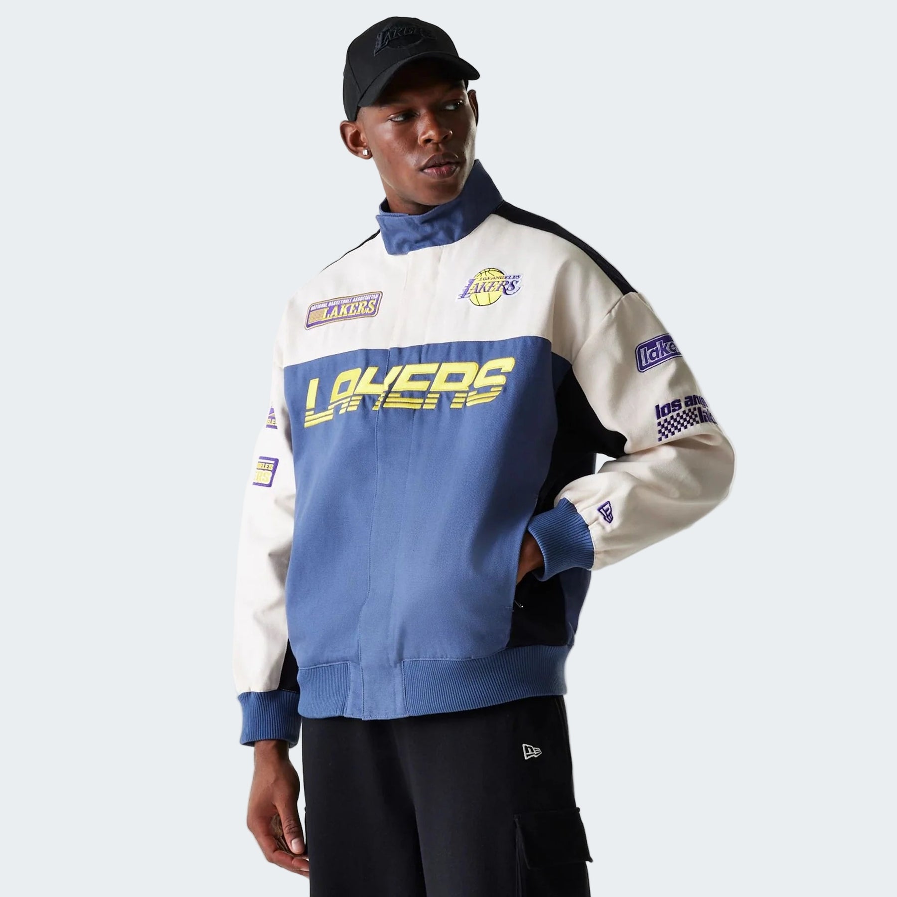 This dark blue LA Lakers jacket by New Era fuses motorsport-inspired style with basketball heritage. Featuring the Lakers logo on the chest, bold team wordmark across the front, NBA and Lakers patches, and racing-style sleeve details — it’s designed for true fans. Crafted from 100% cotton with a full zip and popper closure, exterior and interior pockets, it’s built for both function and fashion.