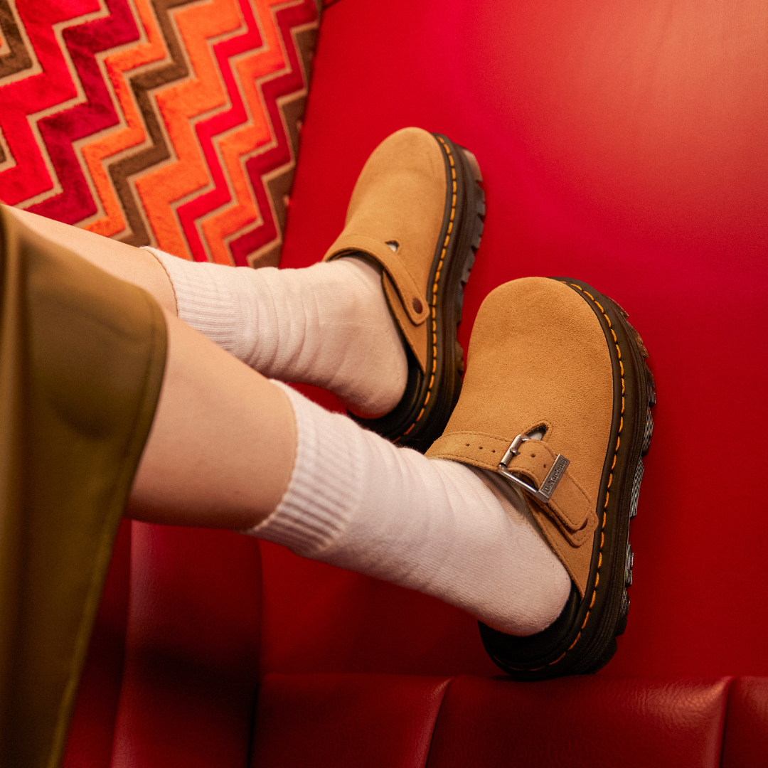The Zebzag Mule is Dr. Martens’ latest innovation in comfort. Built on a hybrid air-cushioned sole that fuses feather-weight EVA with rugged PVC. Crafted from lightweight, versatile suede and designed to be worn however you like – in summer or beyond the conventional season. The adjustable strap ensures a secure fit, while the welted construction delivers signature durability. Yellow welt stitching marks the mules as Dr. Martens.